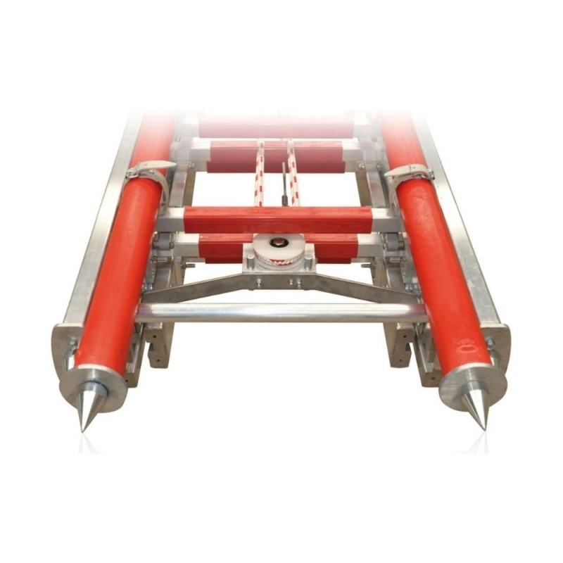 - jekleni konici na spodnjem delu lestve in nosilne cevi zagotavljajo, da trodelna gasilska lestev varno in trdno stoji. Opremljena je z protizdrsno zaščito.