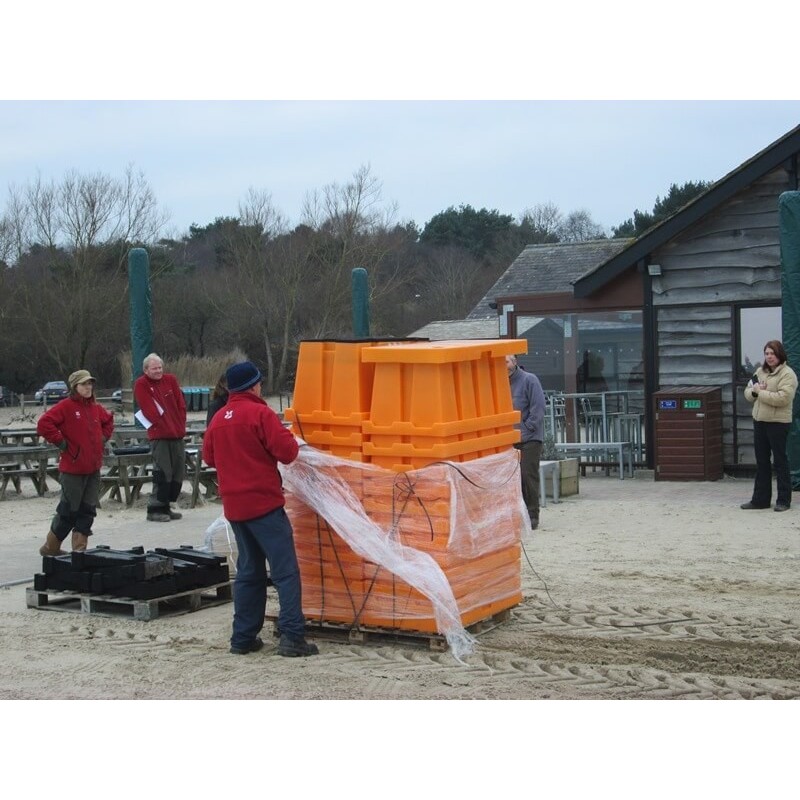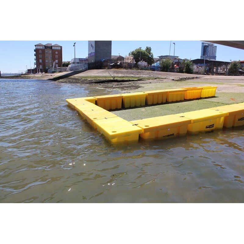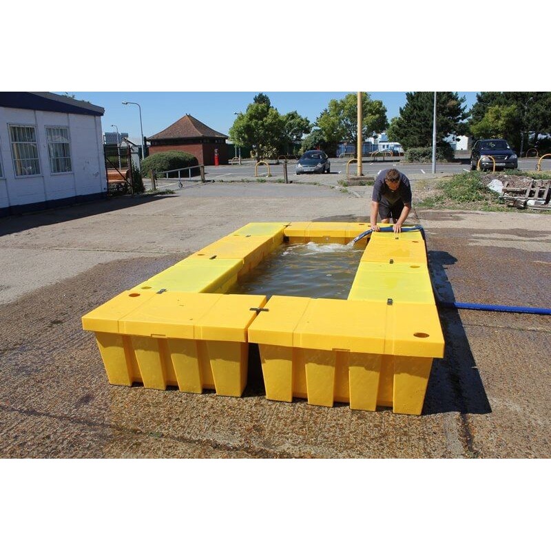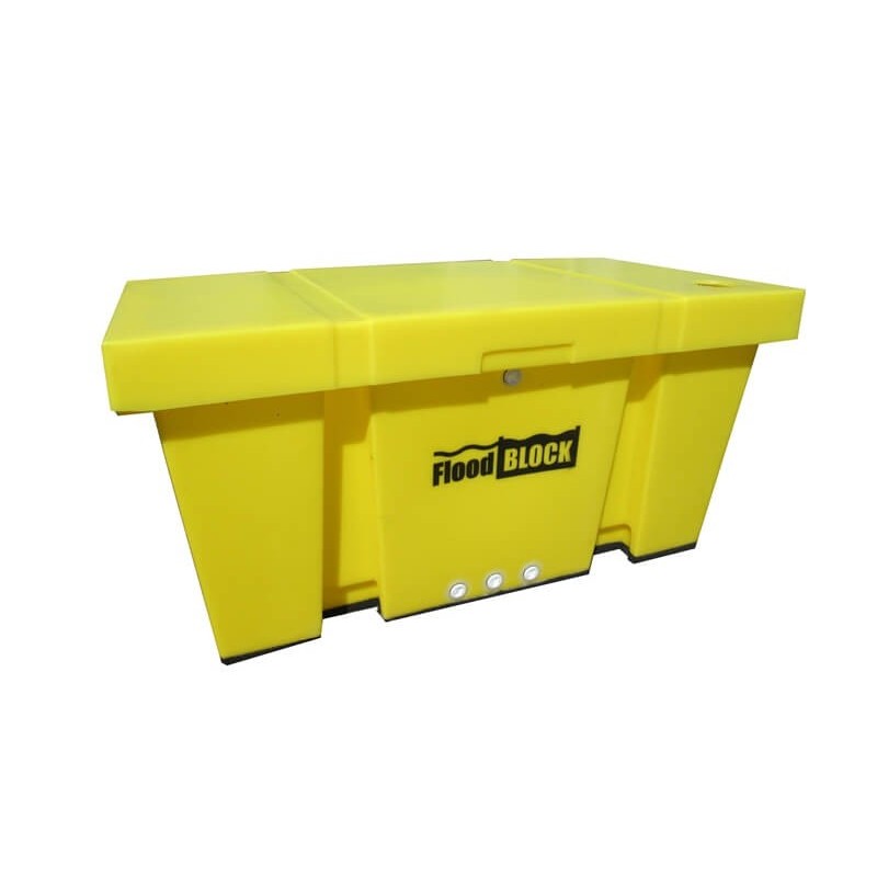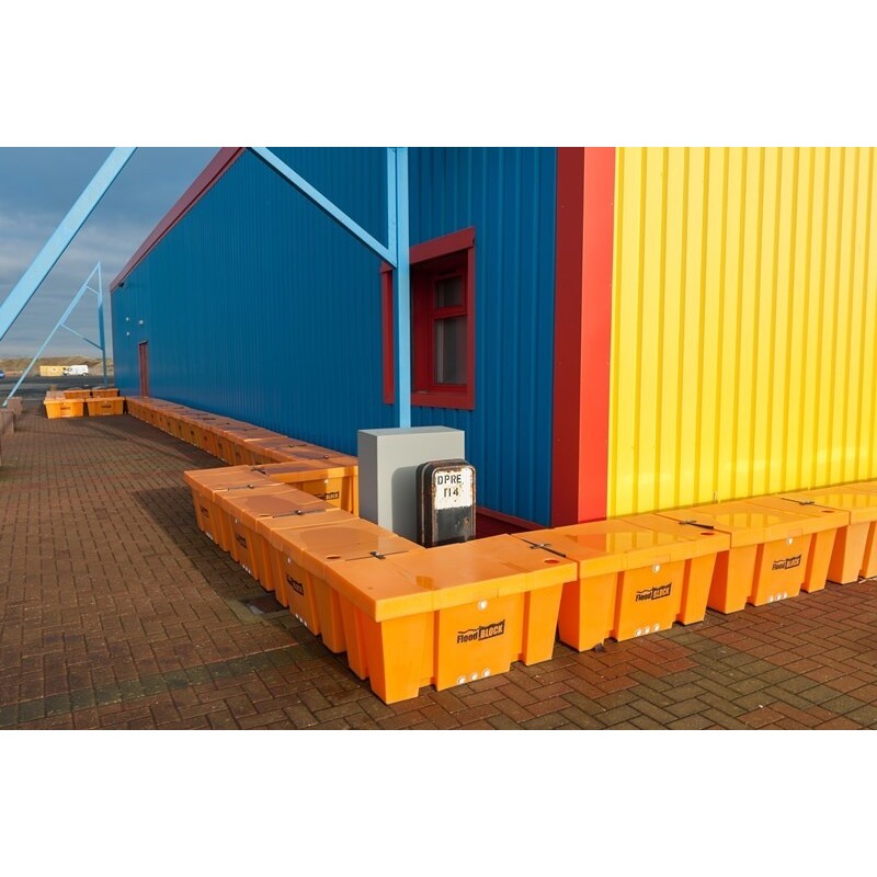 Protipoplavna pregrada FloodBlock™ se sestavlja tako, da z univerzalnim ključem med seboj priključite 1-meter dolge modularne enote. Ključe lahko priključite na katero koli od štirih strani modularne enote. To omogoča vsako pregradno v vse smeri. Pri uporabi se modularne enote dejansko napolnijo z naraščajočimi poplavnimi vodami, ki skupaj s ponderiranimi univerzalnimi ključi zagotavljajo, da sestavljena poplavna pregrada zadrži poplavne vode. Vse enote in ključi vsebujejo trda nosilna tesnila, ki zagotavljajo tesnjenje.
